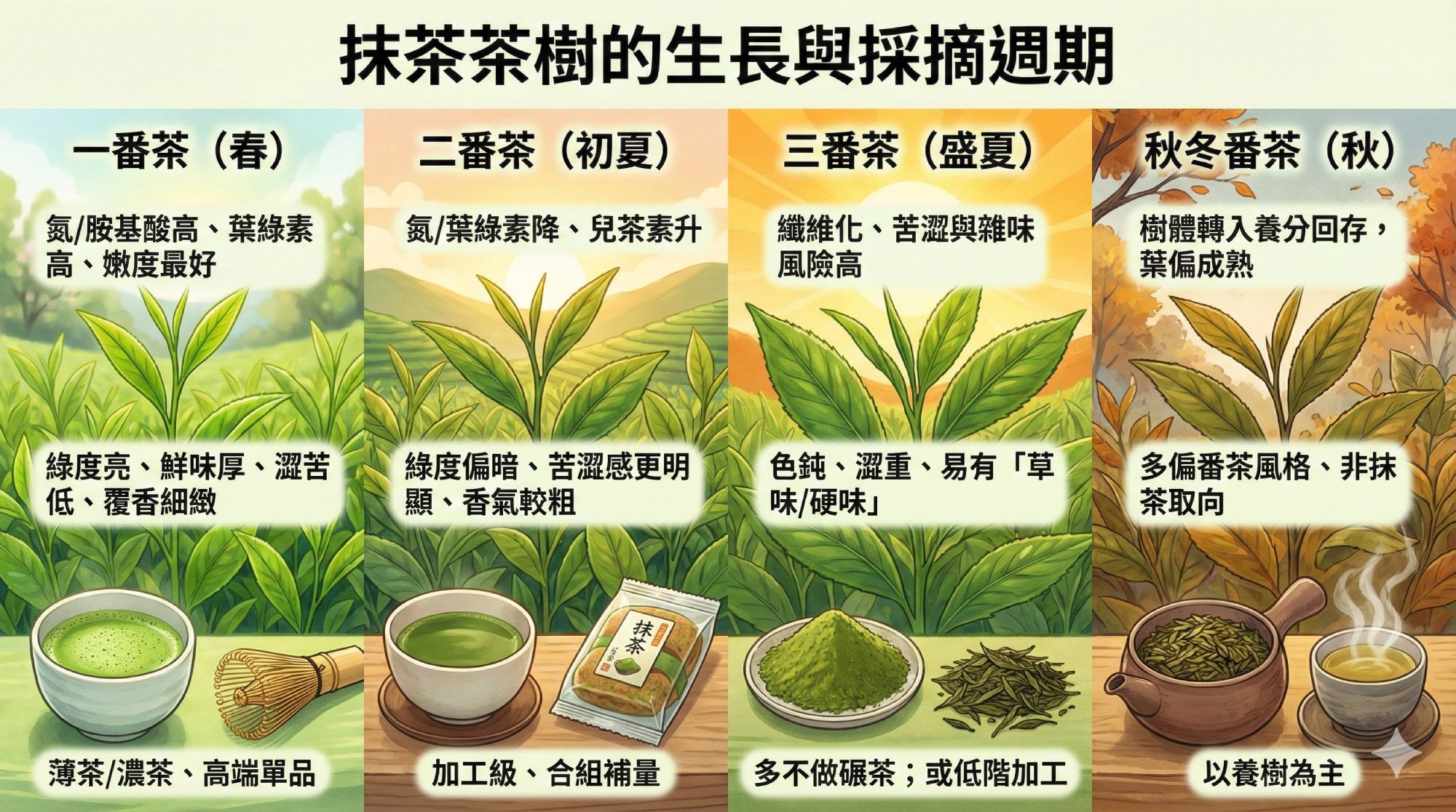 日本茶園一年萌芽採摘大致分「一番茶(春) → 二番茶(初夏) → 三番茶(盛夏) → 四番/秋冬番茶(初秋~秋)」的循環。