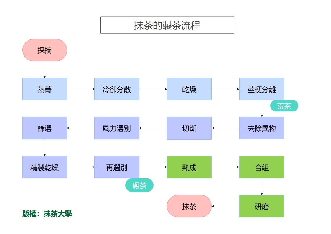 抹茶的製茶流程包括以下各項(個別廠商可能有些微差異):